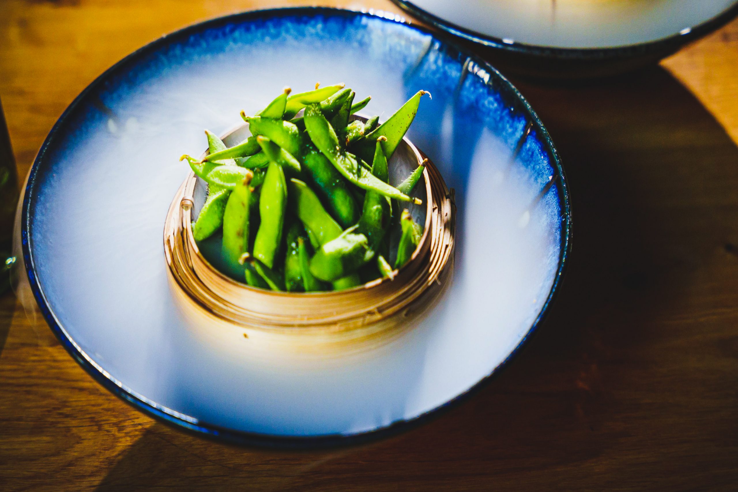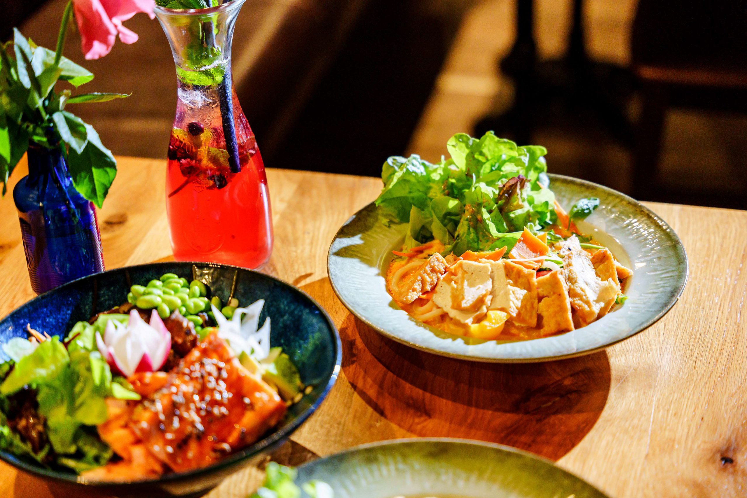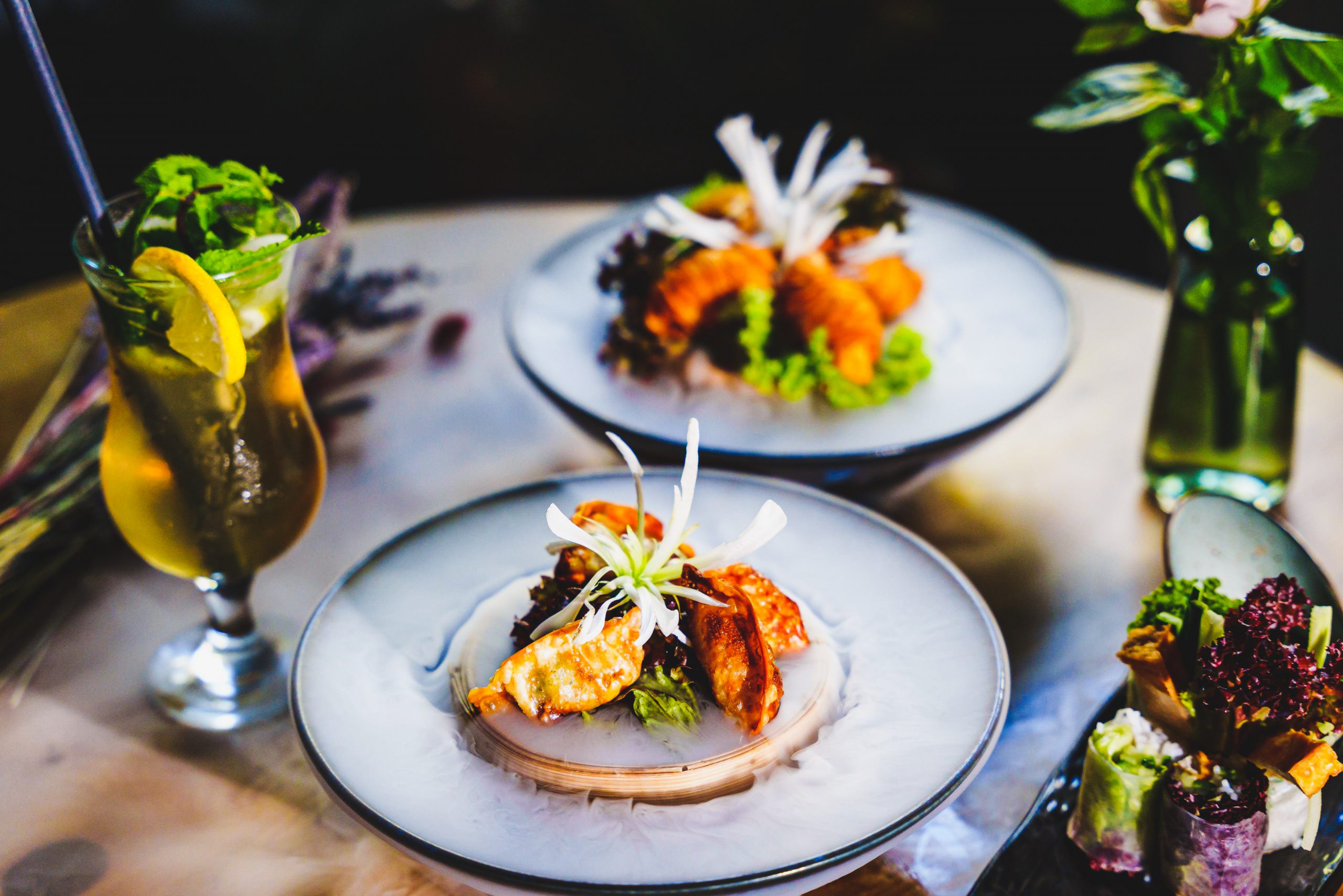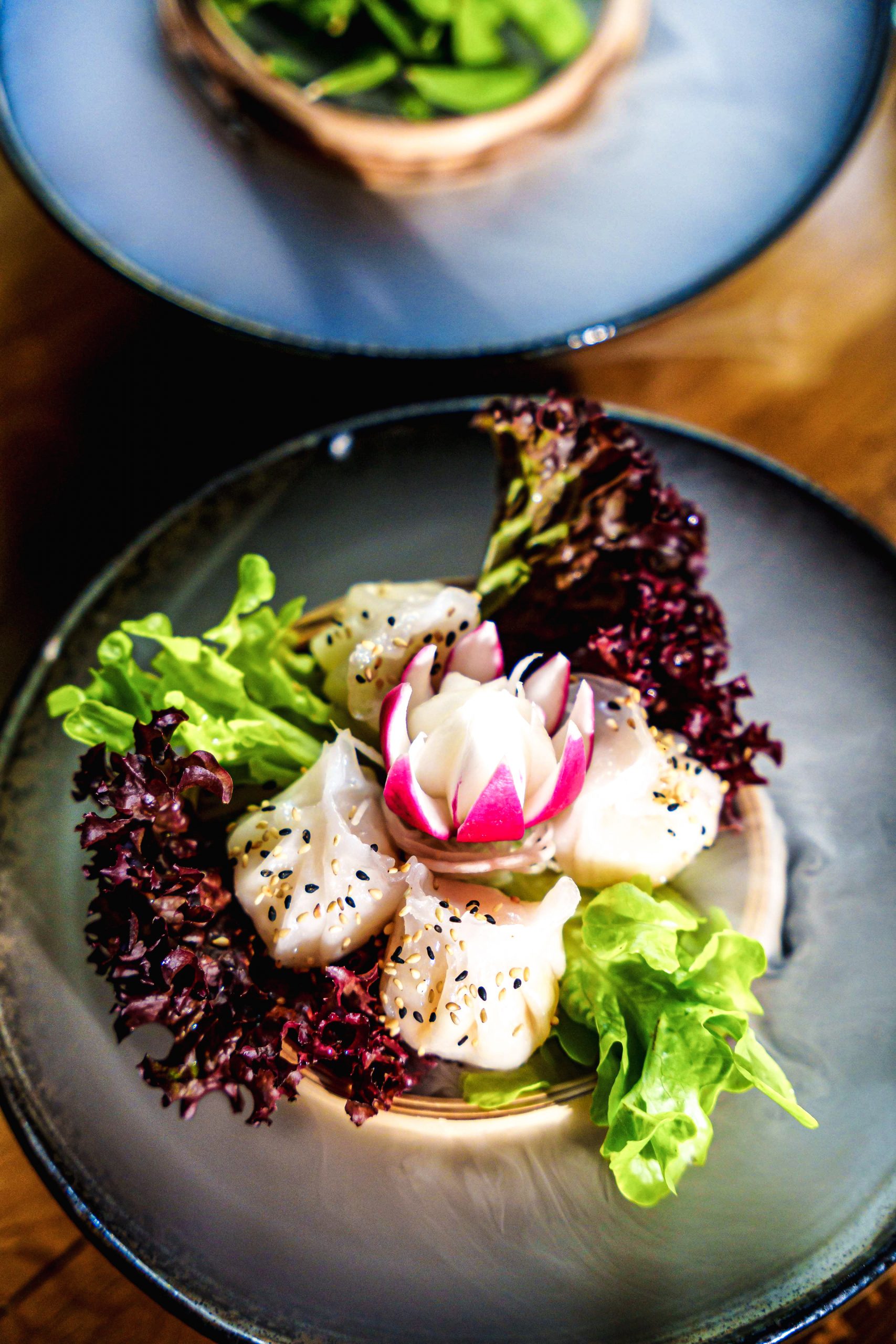 Gedämpfte Reisdumplings mit Garnelen und Wildkräutersalat