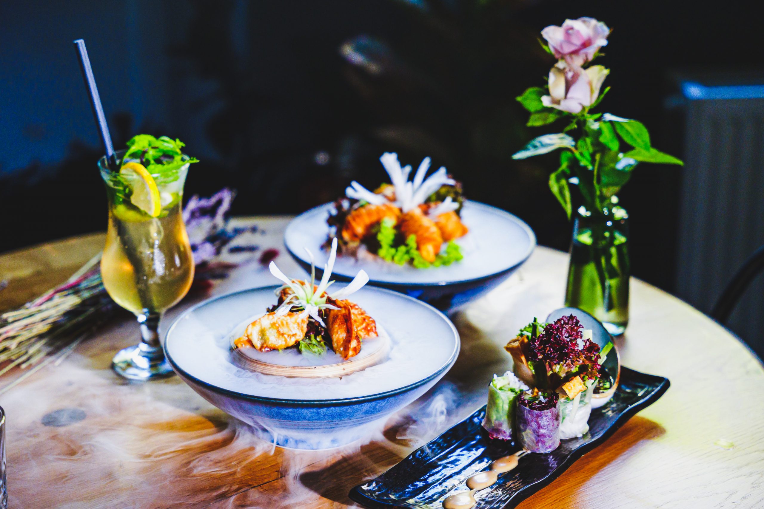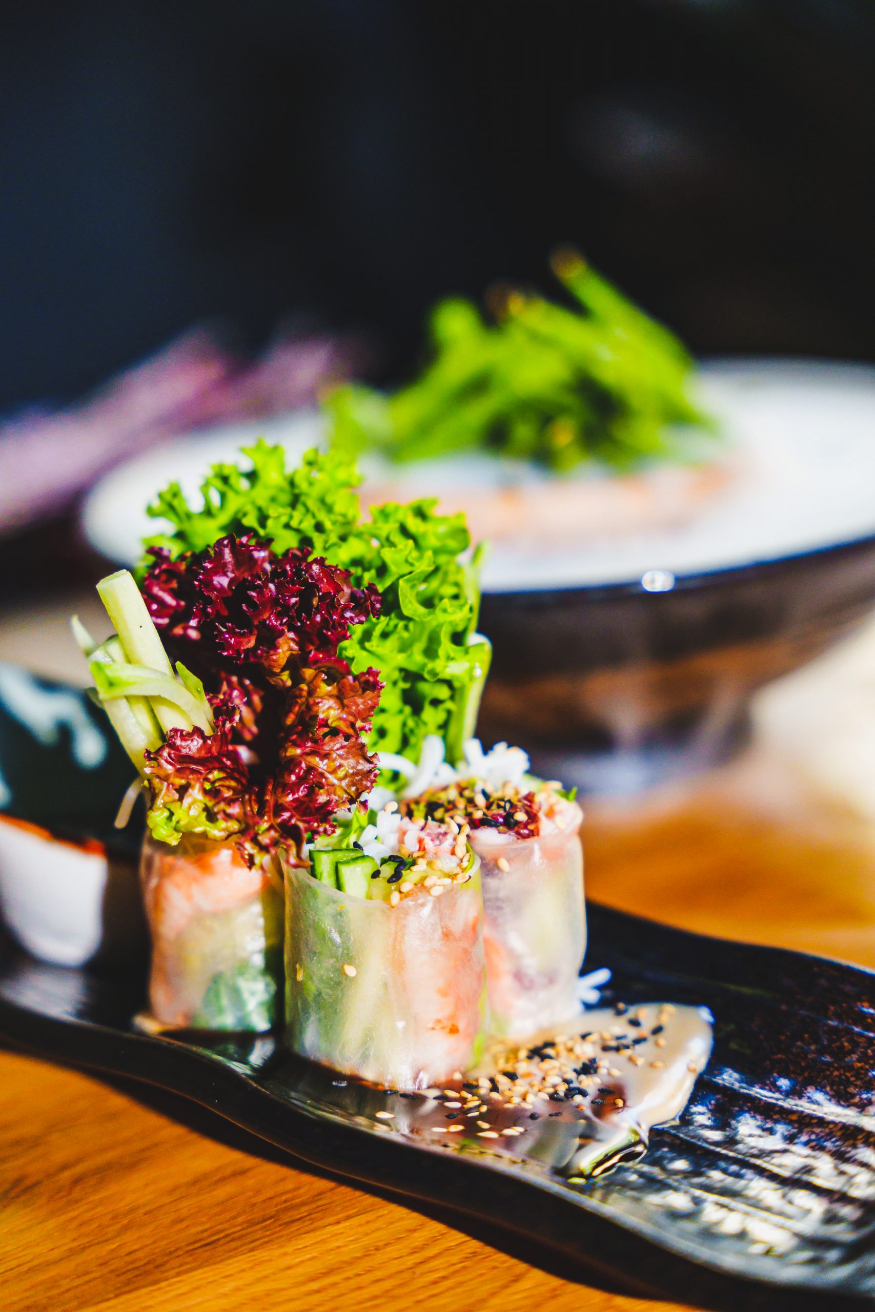 Knusprige Frühlingsrollen serviert mit Wildkräutersalat und Unagi