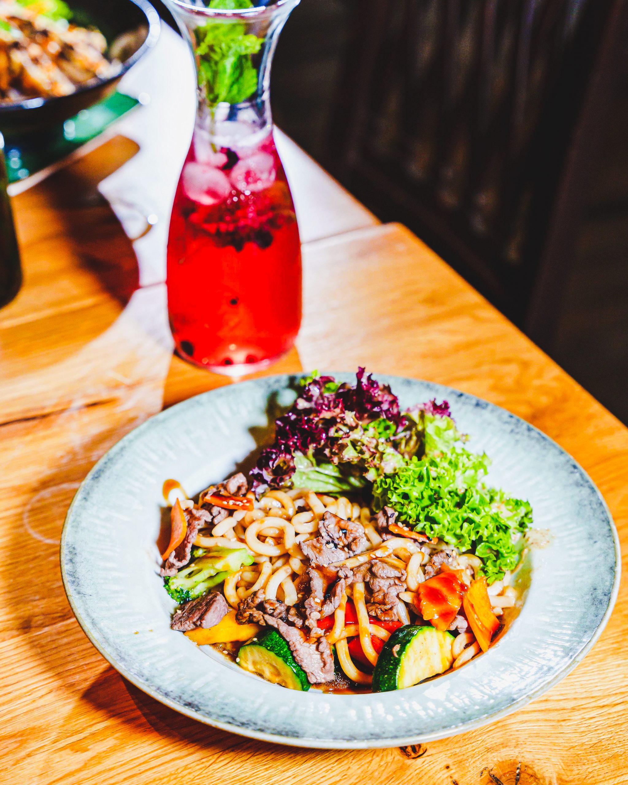 Japanische Udon Nudeln mit Gemüse und Rindfleisch